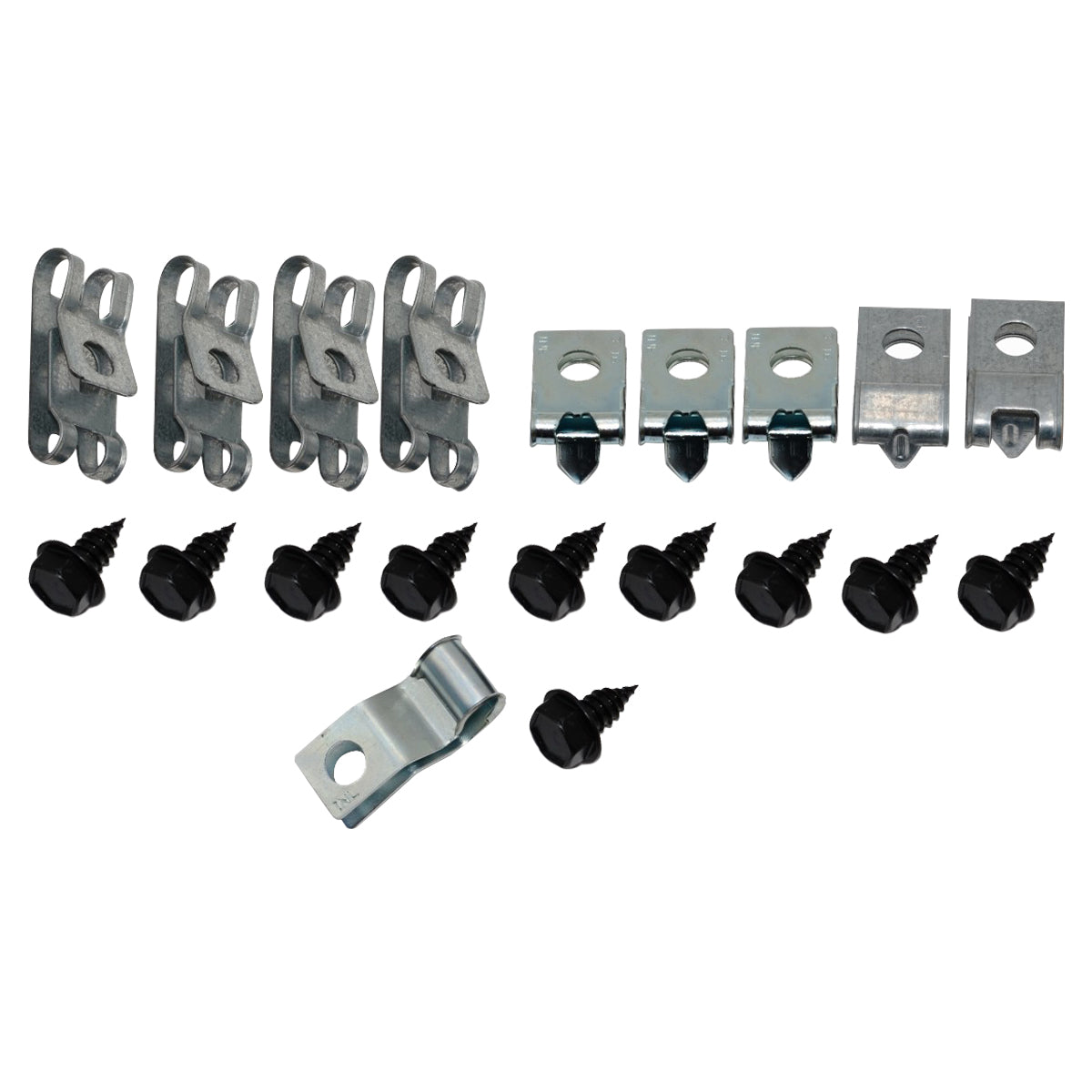 This clip kit includesĀ all clips necessary to secure the brake lines to the chassis of the car: four double clips, fiveĀ R style clips, one rear axle clip, and ten bolts.