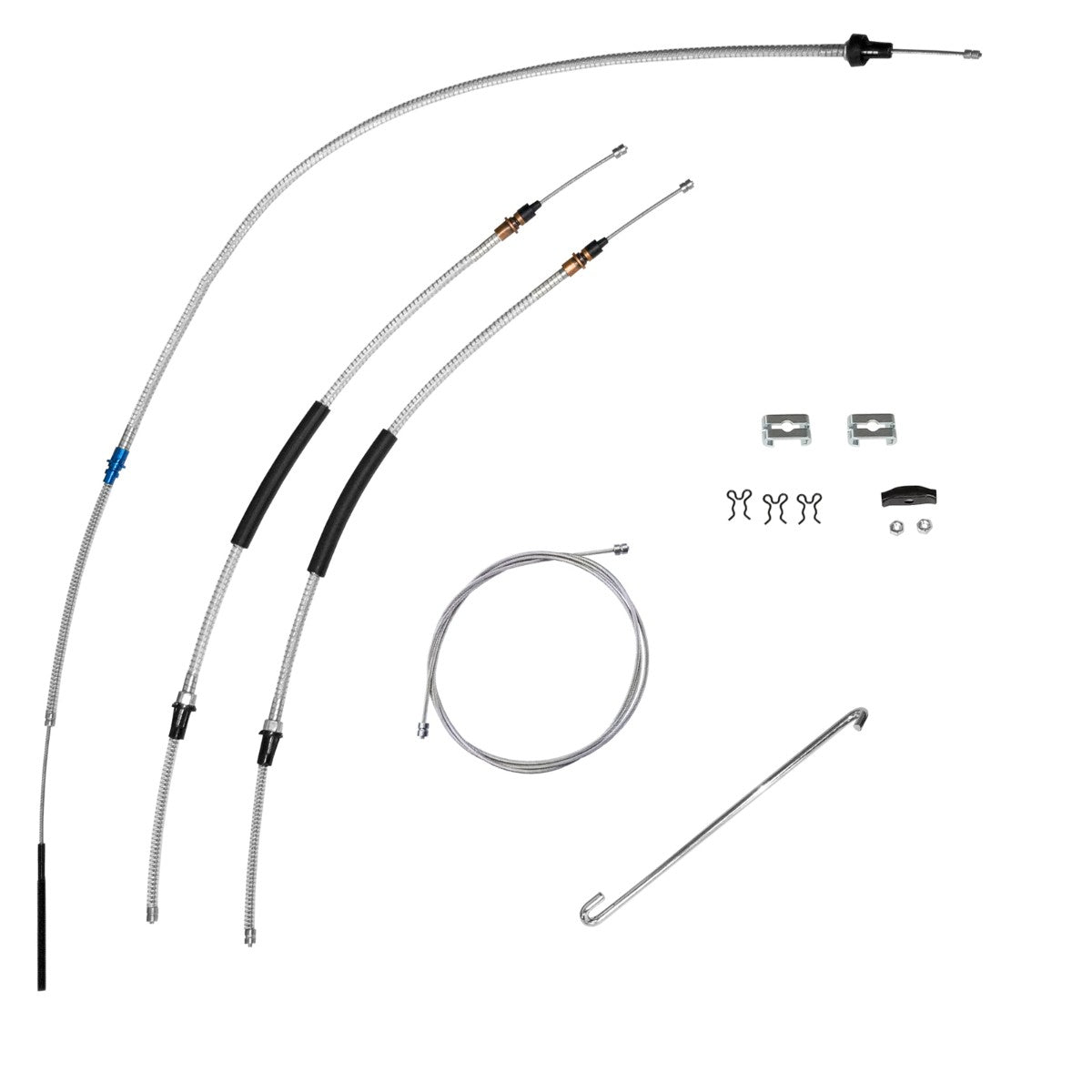 This complete parking brake cable kit replaces all the parking brake cables on your vehicle and includes the front, intermediate, and rear cables as well as all pictured hardware.
