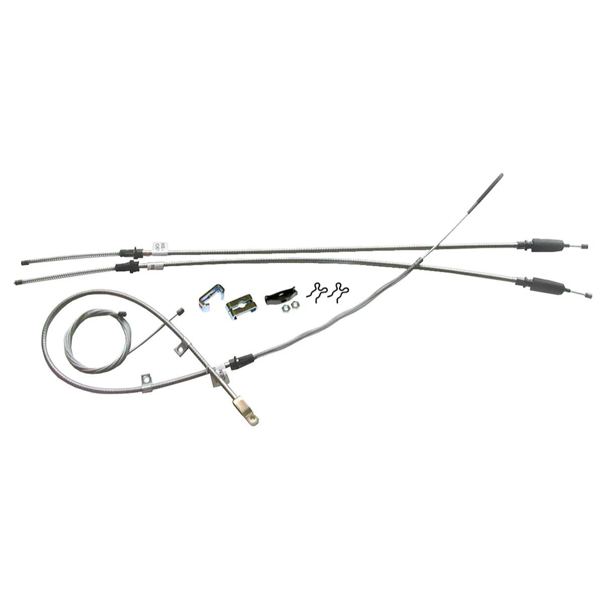 This complete parking brake cable kit replaces all the parking brake cables on your vehicle and includes the front, intermediate, and rear cables as well as all pictured hardware.