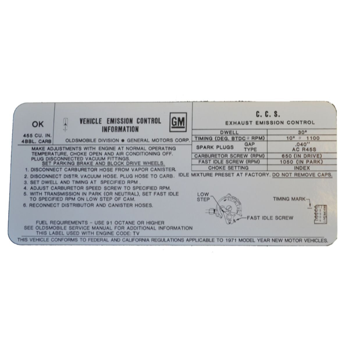 1971 Oldsmobile Cutlass Tune Up Decal 442 With AC OK 455 Automatic Trans 1pc