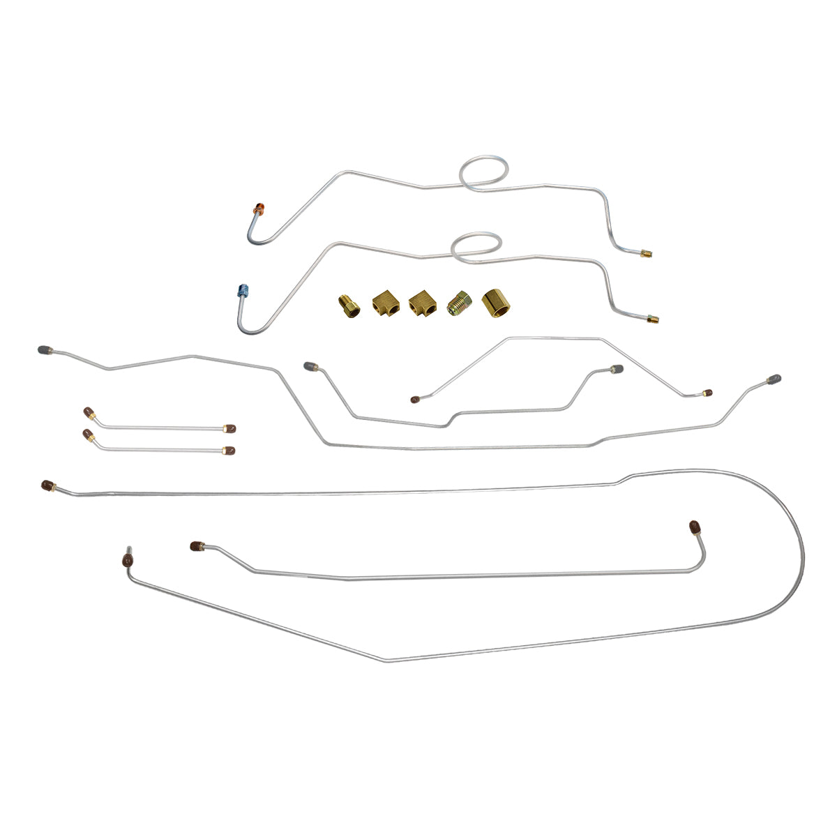 This preformed complete brake line kit will replace all the metal brake lines on your vehicle and includes the master cylinder lines, left front line and right-front crossover line, intermediate lines, and rear axle lines/trailing arm lines.